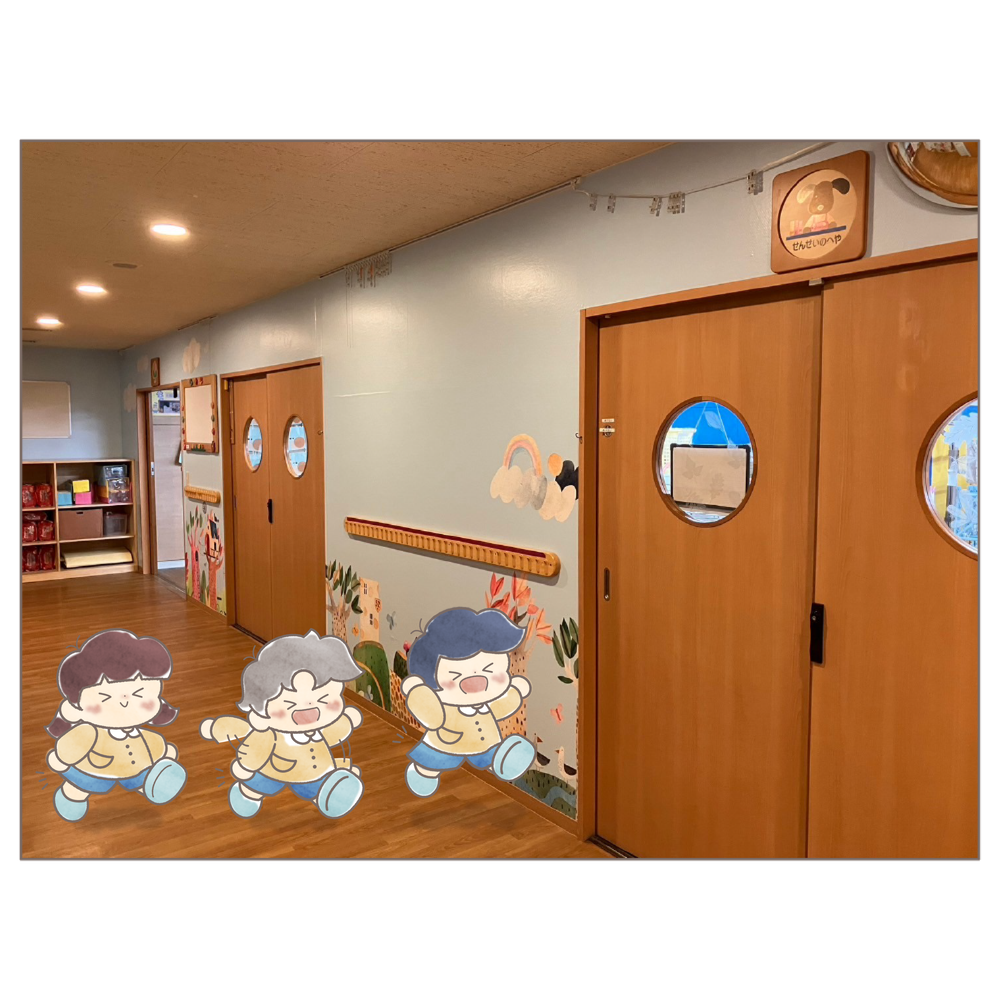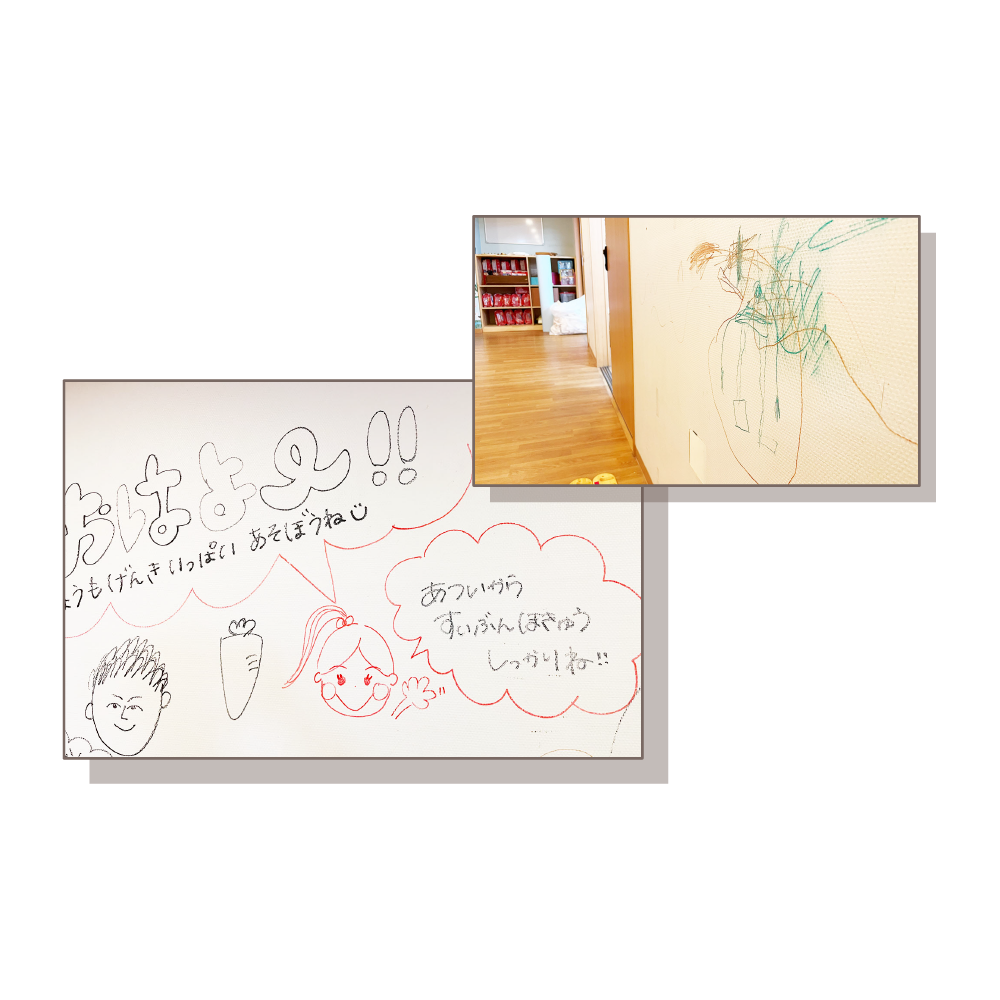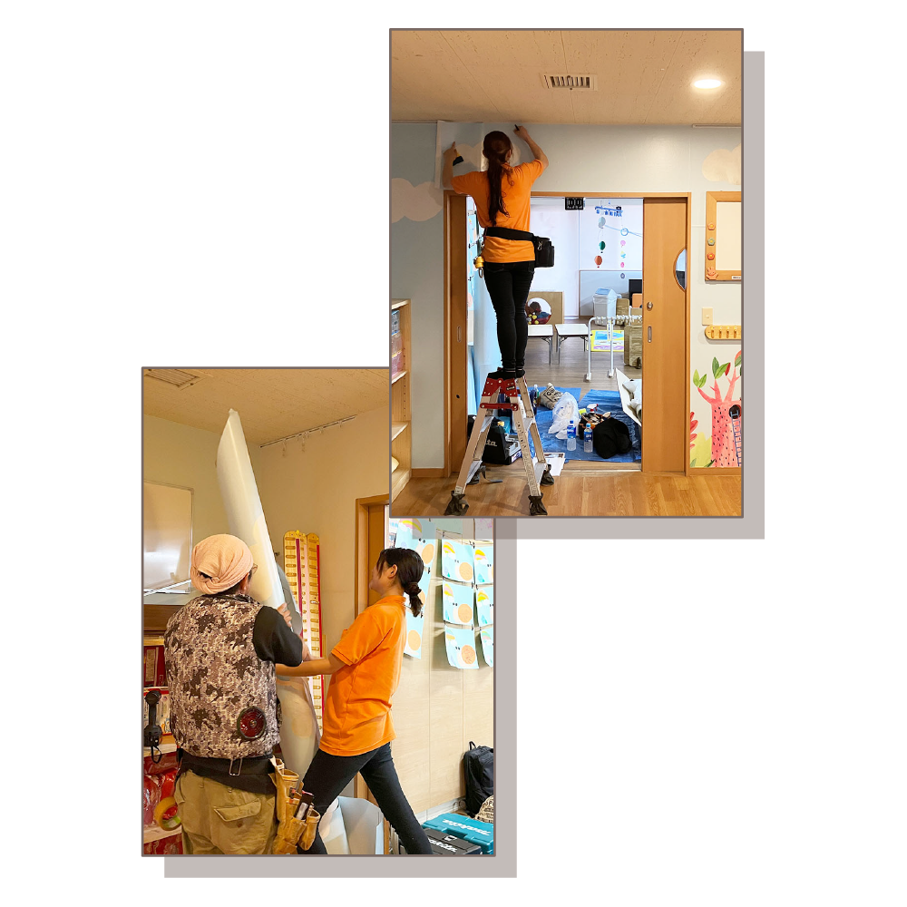 園の子どもたちや先生方が壁紙を貼る前に壁に